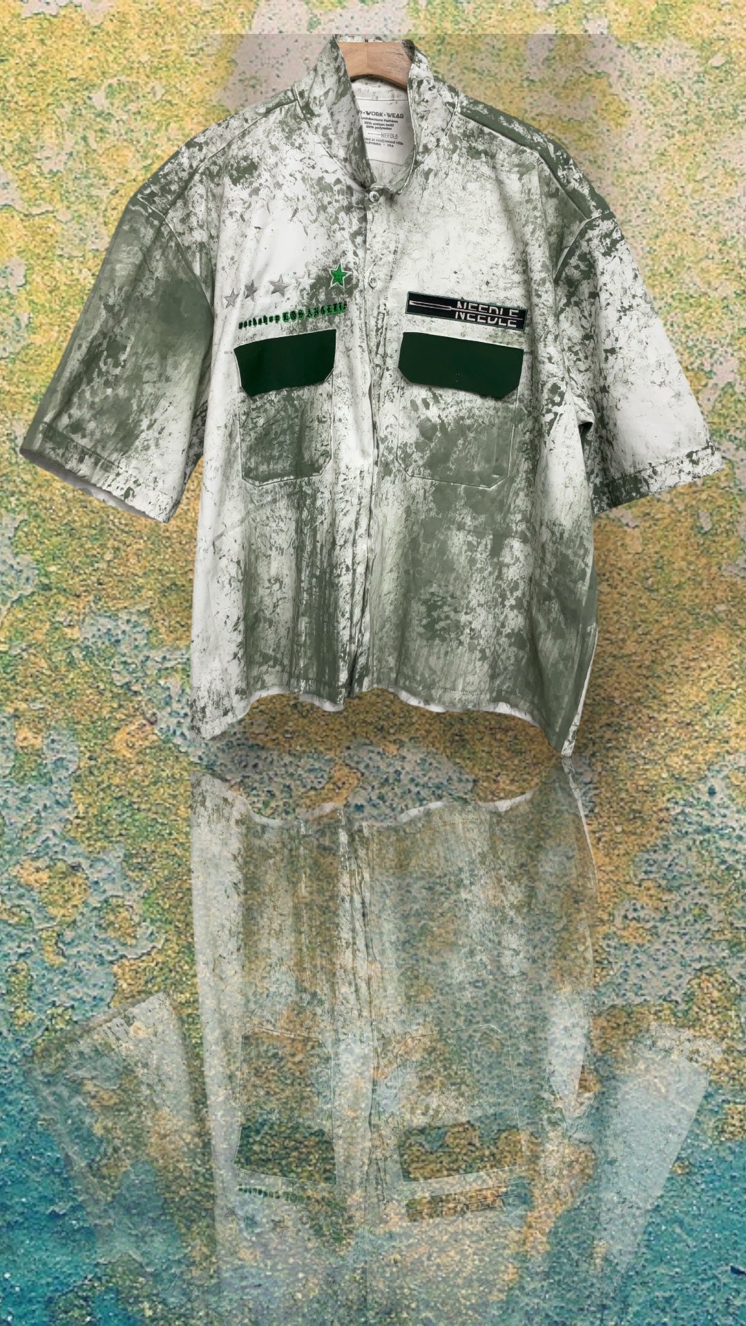 This cropped white shirt, adorned with vibrant strokes of pink and hints of green, effortlessly embodies the fusion of art and architecture. Serving as a canvas, the shirt's lively color palette creates an abstract landscape, reminiscent of the innovative and expressive nature of architectural design. This singular detail elevates the shirt, transforming it into a piece of wearable art that highlights the seamless blend of functionality, aesthetic appeal, and architectural inspiration.